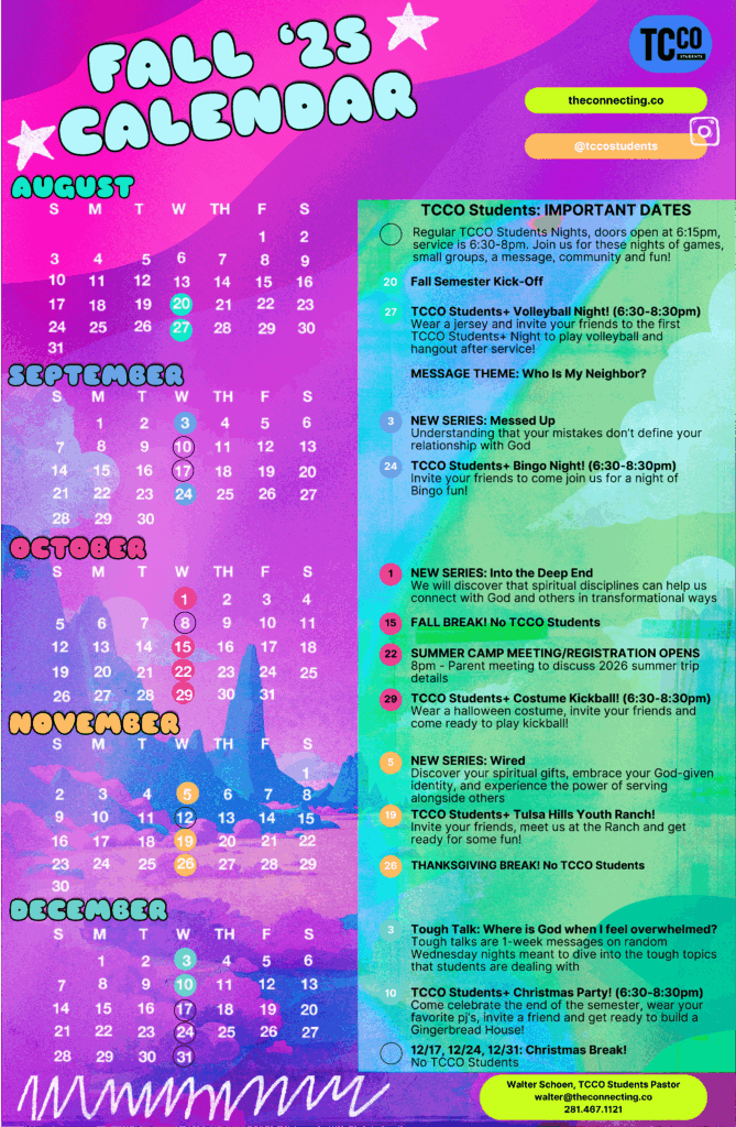 Here in TCCO Students, we are passionate about doing life together, because we know we need each other, and we were not meant or designed to do life alone. We want to invite all 6th-12th grade students to be a part of these upcoming events. Mark your calendar, get registered, and plan to join us for these great opportunities to CONNECT as TCCO Students!